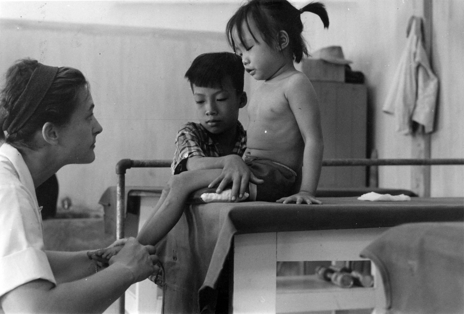 Although the rehabilitation center was located in South Vietnam, staff provided treatment to injured civilians on both sides of the conflict. Patients—including young children—received physical therapy and prosthetic limbs and braces made at the center.