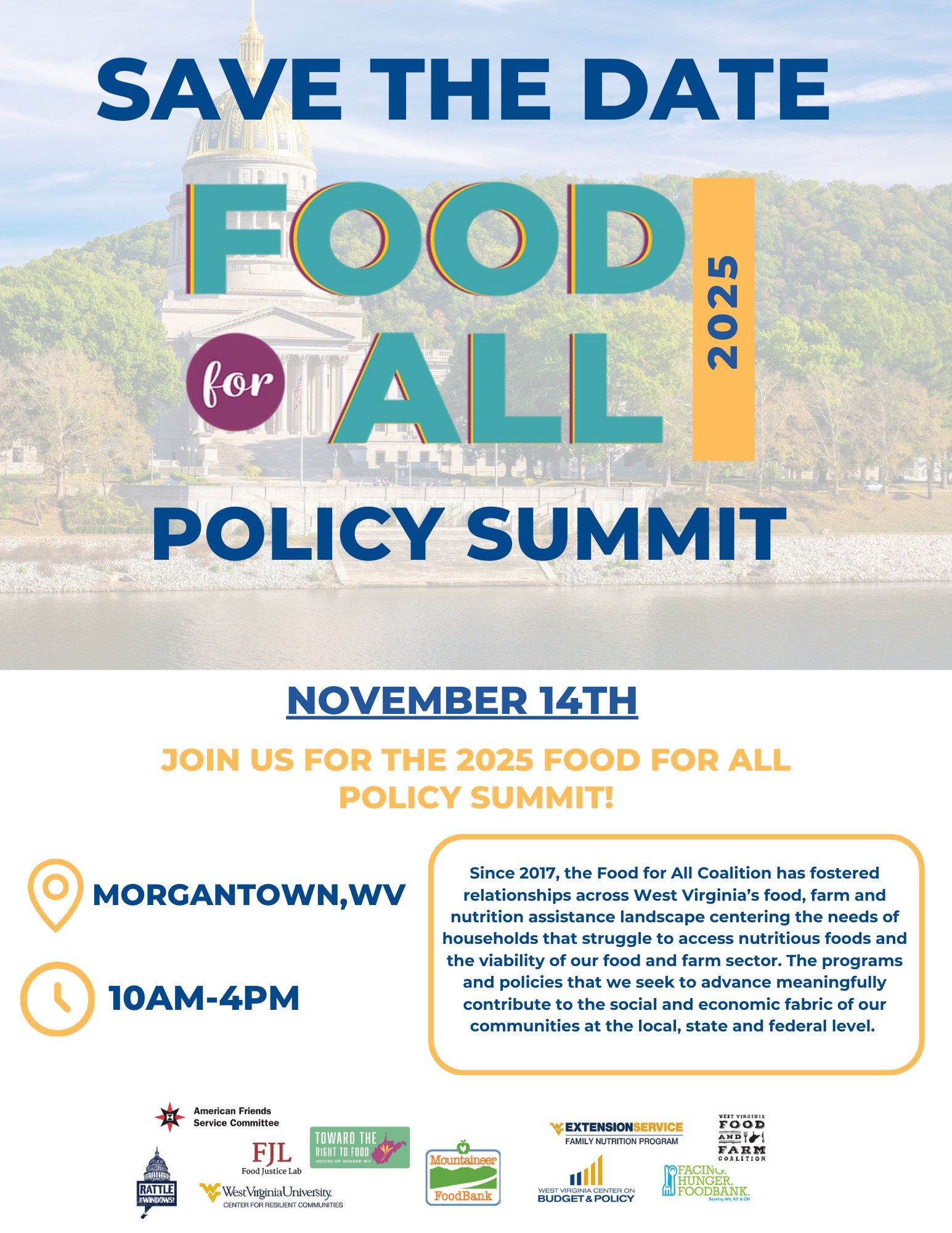 We are excited to be back in Morgantown this year for the Food For All Summit on November 14th. AFSC has been involved with the Food for All coalition since it started in 2017 and it's an understatement to say a lot has changed, even since we last gathered in 2024. Back in 2017 we were winning victories for expanded food access, successfully defeating attempts to curtail SNAP eligibility, and even helped form a Hunger Caucus within the legislature.