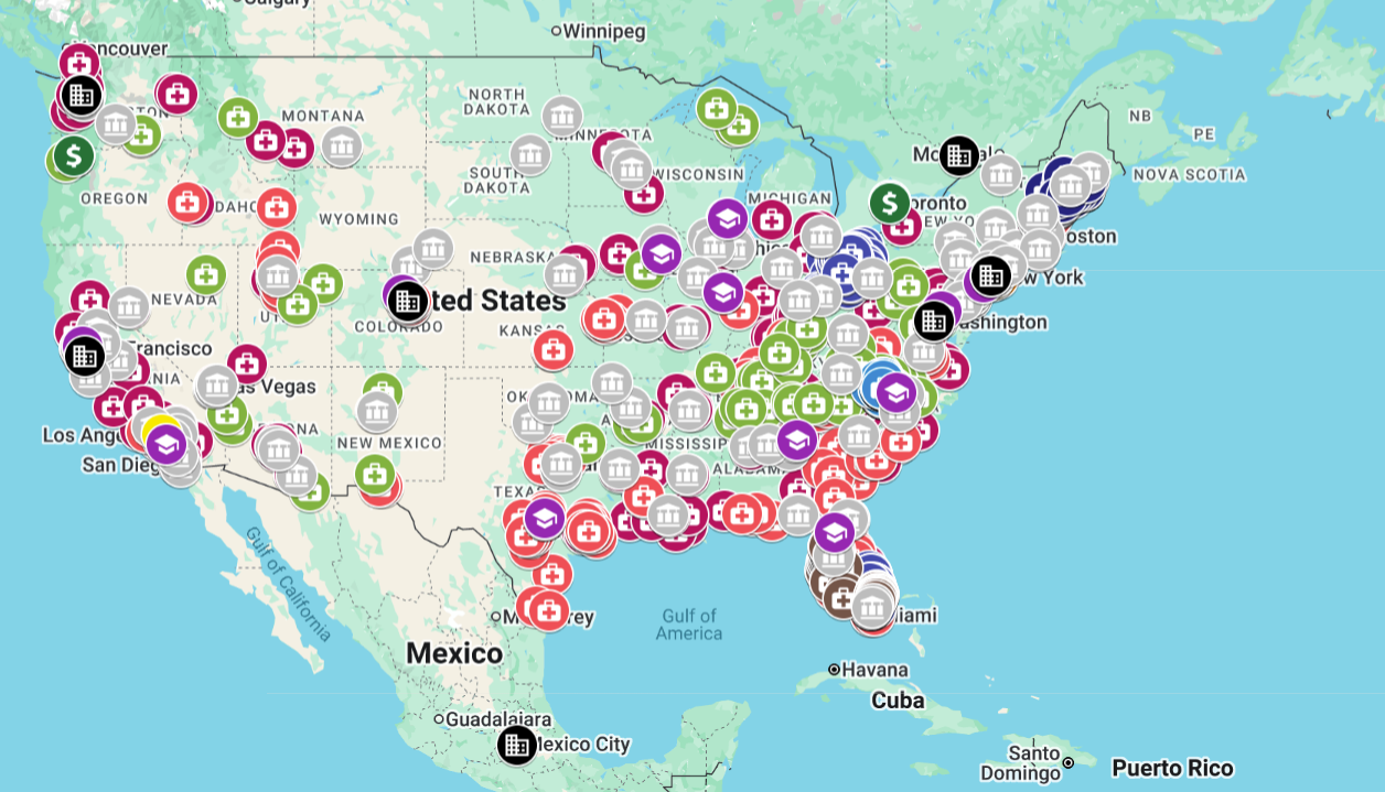 While doing the research for this project, AFSC discovered Palantir ties with major institutions that have been under reported. This includes Johns Hopkins University, Rutgers University-New Brunswick, the University of Illinois Urbana-Champaign, and hospital networks across the country. Notable investors include the California State Teachers Retirement System, the Oregon Public Employees Retirement Fund, and the South Korean National Pension Service. Access the map here.