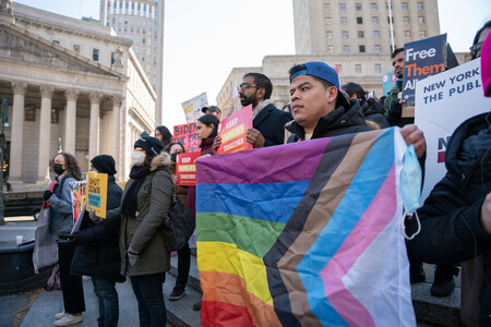 Communities Not Cages action in New York City in March 2022. Cindy Trinh / AFSC